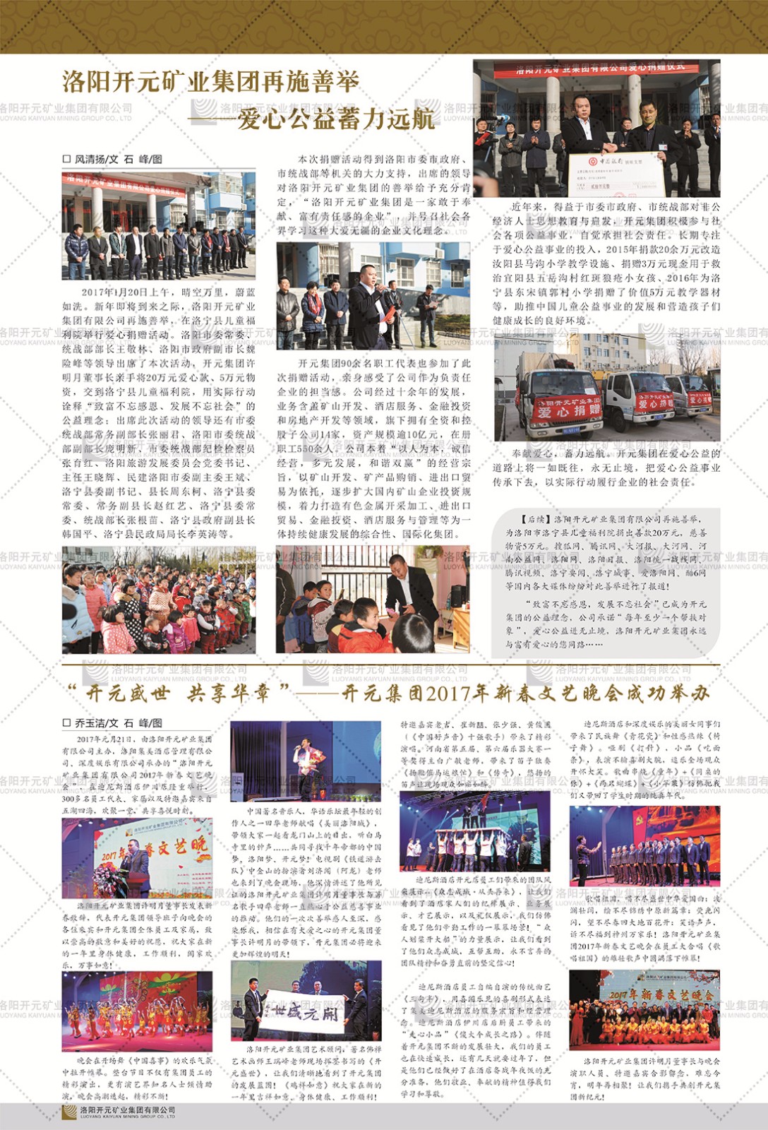 洛陽開元礦業(yè)集團(tuán)有限公司簡介洛陽開元礦業(yè)集團(tuán)有限公司,始成立于2006年,位于洛陽市開元大道269號。集團(tuán)旗下共有五余家全資子公司,業(yè)務(wù)涉及有色金屬礦山開發(fā)、礦產(chǎn)品購銷與進(jìn)出口貿(mào)易、房地產(chǎn)開發(fā)、文化藝術(shù)、企業(yè)管理與咨詢、資本投資等多個領(lǐng)域。民建河南省委委員、民建河南省委企業(yè)委副主任、民建洛陽市委委員、企業(yè)委主任、洛陽民建企業(yè)家協(xié)會會長許明月是公司創(chuàng)始人,現(xiàn)任洛陽開元礦業(yè)集團(tuán)有限公司董事長。在礦業(yè)領(lǐng)域,洛陽開元礦業(yè)集團(tuán)擁有多家實(shí)力雄厚的子公司:貴州開元礦業(yè)有限公司探、采礦權(quán)面積共11.33平方公里;興??h銅鑫礦業(yè)有限公司探礦權(quán)面積8.76平方公里,礦山資源潛力巨大;2021年,開元集團(tuán)與盧氏中科礦業(yè)有限公司開展戰(zhàn)略合作。盧氏中科礦業(yè)有限公司專注于有色金屬的浮選、加工和銷售,擁有強(qiáng)大的技術(shù)支撐平臺,是集探、采、選、冶、研為一體的中大型綜合礦業(yè)企業(yè)。目前,盧氏中科王家河1000噸選礦廠已成功投產(chǎn),雙河金礦、柳關(guān)欒盧鉛鋅礦相繼順利開工,樓房銀礦與圪老灣鉛鋅礦的深部探礦重大突破,標(biāo)志著礦山版圖取得重大進(jìn)展,為開元集團(tuán)后續(xù)發(fā)展奠定了堅實(shí)基礎(chǔ)。在文化傳媒領(lǐng)域,洛陽市明月美術(shù)館通過豐富多樣的藝術(shù)展覽、學(xué)術(shù)研討和公共教育活動,努力打造一個集展覽、交流、教育、研究為一體的綜合性藝術(shù)平臺。此外,在金融投資領(lǐng)域,開元集團(tuán)旗下的北京明峰資本管理有限公司專注于投資具有高增長潛力的優(yōu)秀企業(yè),特別是高科技、新能源、環(huán)保等新興產(chǎn)業(yè),為客戶提供個性化的資產(chǎn)配置服務(wù)。在做好企業(yè)經(jīng)營的同時,開元集團(tuán)始終不忘企業(yè)的社會責(zé)任和家國情懷,以突出的愛心公益事跡,開展了一系列公益慈善活動:“民建林”公益事業(yè)通過“思源基金”“幫幫公益”線上公益平臺,與眾多愛心人士籌措資金20余萬元;資助541名貧困大學(xué)生共計270余萬元,推進(jìn)“數(shù)字助力——河南AI人才培養(yǎng)”;捐款10萬元,馳援京津冀、黑龍江洪水地質(zhì)災(zāi)害……公司于2017年底被洛陽市慈善總會評為“洛陽慈善風(fēng)云榜——十大愛心集體”。洛陽開元礦業(yè)集團(tuán)有限公司秉承持續(xù)發(fā)展理念,憑借多年來良好的企業(yè)信譽(yù)與經(jīng)營業(yè)績,與全國多家企業(yè)建立了良好合作關(guān)系,受到社會各界的一致好評,多次榮獲“納稅標(biāo)兵”“先進(jìn)企業(yè)”“招商引資模范企業(yè)”等榮譽(yù)稱號?;赝麃頃r路,開元人勠力同心,以“闖”的精神和“創(chuàng)”的勁頭,一路披荊斬棘,踏過千山萬水;展望新未來,開元人凝心聚力,不執(zhí)于“舊”,無畏于“新”,秉承“勇于跨越,追求卓越”的企業(yè)精神,乘著國家高質(zhì)量發(fā)展新征程的東風(fēng),跨過高山,越過大海,向著集團(tuán)多元化、國際化的目標(biāo),逐夢遠(yuǎn)航,跨越前行!