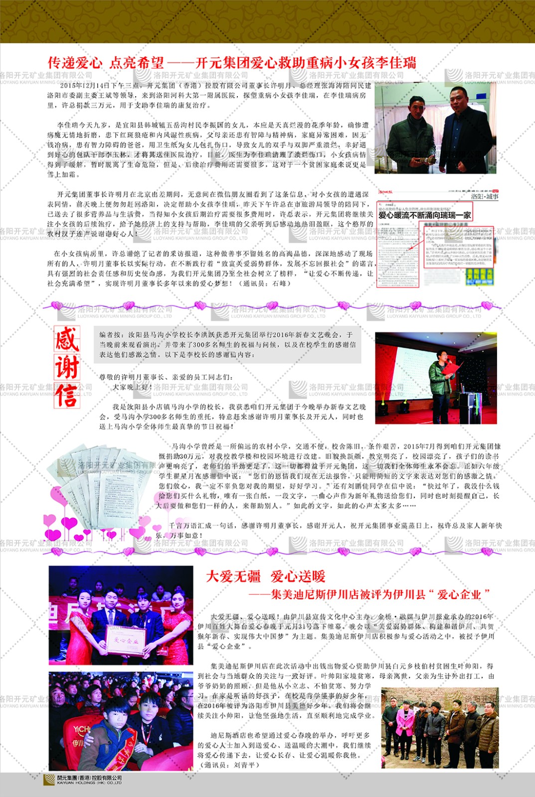 洛陽開元礦業(yè)集團有限公司簡介洛陽開元礦業(yè)集團有限公司,始成立于2006年,位于洛陽市開元大道269號。集團旗下共有五余家全資子公司,業(yè)務涉及有色金屬礦山開發(fā)、礦產品購銷與進出口貿易、房地產開發(fā)、文化藝術、企業(yè)管理與咨詢、資本投資等多個領域。民建河南省委委員、民建河南省委企業(yè)委副主任、民建洛陽市委委員、企業(yè)委主任、洛陽民建企業(yè)家協(xié)會會長許明月是公司創(chuàng)始人,現任洛陽開元礦業(yè)集團有限公司董事長。在礦業(yè)領域,洛陽開元礦業(yè)集團擁有多家實力雄厚的子公司:貴州開元礦業(yè)有限公司探、采礦權面積共11.33平方公里;興??h銅鑫礦業(yè)有限公司探礦權面積8.76平方公里,礦山資源潛力巨大;2021年,開元集團與盧氏中科礦業(yè)有限公司開展戰(zhàn)略合作。盧氏中科礦業(yè)有限公司專注于有色金屬的浮選、加工和銷售,擁有強大的技術支撐平臺,是集探、采、選、冶、研為一體的中大型綜合礦業(yè)企業(yè)。目前,盧氏中科王家河1000噸選礦廠已成功投產,雙河金礦、柳關欒盧鉛鋅礦相繼順利開工,樓房銀礦與圪老灣鉛鋅礦的深部探礦重大突破,標志著礦山版圖取得重大進展,為開元集團后續(xù)發(fā)展奠定了堅實基礎。在文化傳媒領域,洛陽市明月美術館通過豐富多樣的藝術展覽、學術研討和公共教育活動,努力打造一個集展覽、交流、教育、研究為一體的綜合性藝術平臺。此外,在金融投資領域,開元集團旗下的北京明峰資本管理有限公司專注于投資具有高增長潛力的優(yōu)秀企業(yè),特別是高科技、新能源、環(huán)保等新興產業(yè),為客戶提供個性化的資產配置服務。在做好企業(yè)經營的同時,開元集團始終不忘企業(yè)的社會責任和家國情懷,以突出的愛心公益事跡,開展了一系列公益慈善活動:“民建林”公益事業(yè)通過“思源基金”“幫幫公益”線上公益平臺,與眾多愛心人士籌措資金20余萬元;資助541名貧困大學生共計270余萬元,推進“數字助力——河南AI人才培養(yǎng)”;捐款10萬元,馳援京津冀、黑龍江洪水地質災害……公司于2017年底被洛陽市慈善總會評為“洛陽慈善風云榜——十大愛心集體”。洛陽開元礦業(yè)集團有限公司秉承持續(xù)發(fā)展理念,憑借多年來良好的企業(yè)信譽與經營業(yè)績,與全國多家企業(yè)建立了良好合作關系,受到社會各界的一致好評,多次榮獲“納稅標兵”“先進企業(yè)”“招商引資模范企業(yè)”等榮譽稱號?;赝麃頃r路,開元人勠力同心,以“闖”的精神和“創(chuàng)”的勁頭,一路披荊斬棘,踏過千山萬水;展望新未來,開元人凝心聚力,不執(zhí)于“舊”,無畏于“新”,秉承“勇于跨越,追求卓越”的企業(yè)精神,乘著國家高質量發(fā)展新征程的東風,跨過高山,越過大海,向著集團多元化、國際化的目標,逐夢遠航,跨越前行!