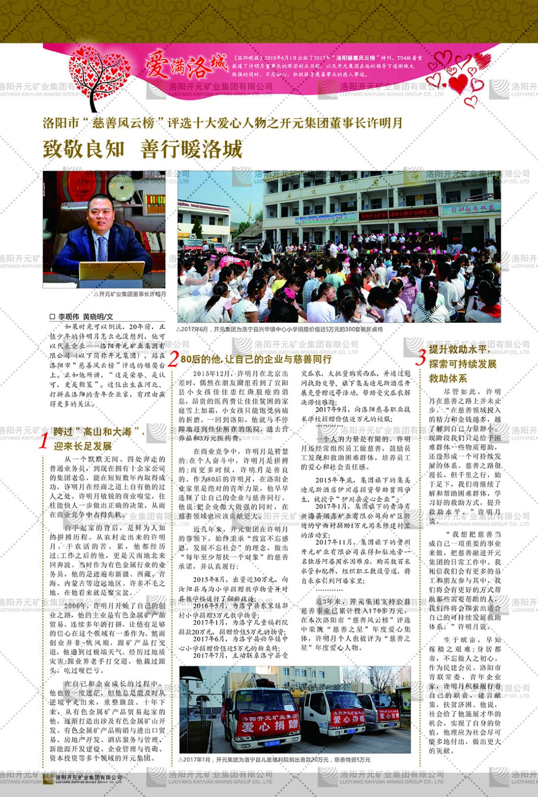 洛陽開元礦業(yè)集團(tuán)有限公司簡介洛陽開元礦業(yè)集團(tuán)有限公司,始成立于2006年,位于洛陽市開元大道269號。集團(tuán)旗下共有五余家全資子公司,業(yè)務(wù)涉及有色金屬礦山開發(fā)、礦產(chǎn)品購銷與進(jìn)出口貿(mào)易、房地產(chǎn)開發(fā)、文化藝術(shù)、企業(yè)管理與咨詢、資本投資等多個(gè)領(lǐng)域。民建河南省委委員、民建河南省委企業(yè)委副主任、民建洛陽市委委員、企業(yè)委主任、洛陽民建企業(yè)家協(xié)會會長許明月是公司創(chuàng)始人,現(xiàn)任洛陽開元礦業(yè)集團(tuán)有限公司董事長。在礦業(yè)領(lǐng)域,洛陽開元礦業(yè)集團(tuán)擁有多家實(shí)力雄厚的子公司:貴州開元礦業(yè)有限公司探、采礦權(quán)面積共11.33平方公里;興??h銅鑫礦業(yè)有限公司探礦權(quán)面積8.76平方公里,礦山資源潛力巨大;2021年,開元集團(tuán)與盧氏中科礦業(yè)有限公司開展戰(zhàn)略合作。盧氏中科礦業(yè)有限公司專注于有色金屬的浮選、加工和銷售,擁有強(qiáng)大的技術(shù)支撐平臺,是集探、采、選、冶、研為一體的中大型綜合礦業(yè)企業(yè)。目前,盧氏中科王家河1000噸選礦廠已成功投產(chǎn),雙河金礦、柳關(guān)欒盧鉛鋅礦相繼順利開工,樓房銀礦與圪老灣鉛鋅礦的深部探礦重大突破,標(biāo)志著礦山版圖取得重大進(jìn)展,為開元集團(tuán)后續(xù)發(fā)展奠定了堅(jiān)實(shí)基礎(chǔ)。在文化傳媒領(lǐng)域,洛陽市明月美術(shù)館通過豐富多樣的藝術(shù)展覽、學(xué)術(shù)研討和公共教育活動,努力打造一個(gè)集展覽、交流、教育、研究為一體的綜合性藝術(shù)平臺。此外,在金融投資領(lǐng)域,開元集團(tuán)旗下的北京明峰資本管理有限公司專注于投資具有高增長潛力的優(yōu)秀企業(yè),特別是高科技、新能源、環(huán)保等新興產(chǎn)業(yè),為客戶提供個(gè)性化的資產(chǎn)配置服務(wù)。在做好企業(yè)經(jīng)營的同時(shí),開元集團(tuán)始終不忘企業(yè)的社會責(zé)任和家國情懷,以突出的愛心公益事跡,開展了一系列公益慈善活動:“民建林”公益事業(yè)通過“思源基金”“幫幫公益”線上公益平臺,與眾多愛心人士籌措資金20余萬元;資助541名貧困大學(xué)生共計(jì)270余萬元,推進(jìn)“數(shù)字助力——河南AI人才培養(yǎng)”;捐款10萬元,馳援京津冀、黑龍江洪水地質(zhì)災(zāi)害……公司于2017年底被洛陽市慈善總會評為“洛陽慈善風(fēng)云榜——十大愛心集體”。洛陽開元礦業(yè)集團(tuán)有限公司秉承持續(xù)發(fā)展理念,憑借多年來良好的企業(yè)信譽(yù)與經(jīng)營業(yè)績,與全國多家企業(yè)建立了良好合作關(guān)系,受到社會各界的一致好評,多次榮獲“納稅標(biāo)兵”“先進(jìn)企業(yè)”“招商引資模范企業(yè)”等榮譽(yù)稱號?;赝麃頃r(shí)路,開元人勠力同心,以“闖”的精神和“創(chuàng)”的勁頭,一路披荊斬棘,踏過千山萬水;展望新未來,開元人凝心聚力,不執(zhí)于“舊”,無畏于“新”,秉承“勇于跨越,追求卓越”的企業(yè)精神,乘著國家高質(zhì)量發(fā)展新征程的東風(fēng),跨過高山,越過大海,向著集團(tuán)多元化、國際化的目標(biāo),逐夢遠(yuǎn)航,跨越前行!