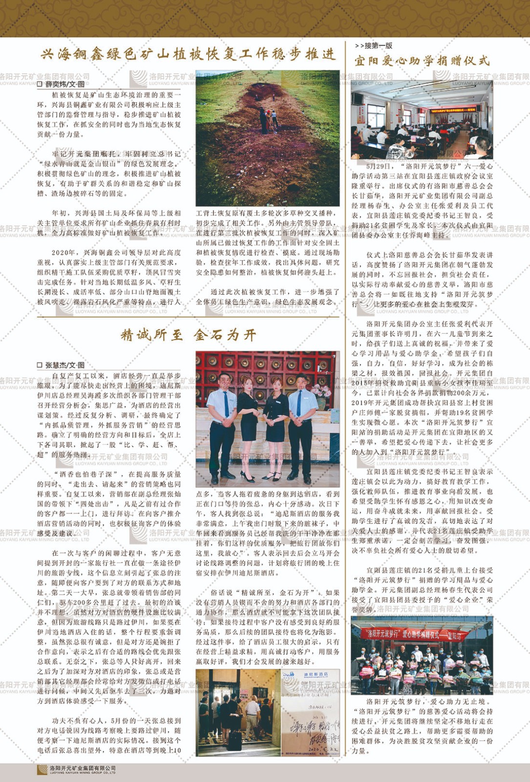 洛陽開元礦業(yè)集團有限公司簡介洛陽開元礦業(yè)集團有限公司,始成立于2006年,位于洛陽市開元大道269號。集團旗下共有五余家全資子公司,業(yè)務涉及有色金屬礦山開發(fā)、礦產品購銷與進出口貿易、房地產開發(fā)、文化藝術、企業(yè)管理與咨詢、資本投資等多個領域。民建河南省委委員、民建河南省委企業(yè)委副主任、民建洛陽市委委員、企業(yè)委主任、洛陽民建企業(yè)家協(xié)會會長許明月是公司創(chuàng)始人,現任洛陽開元礦業(yè)集團有限公司董事長。在礦業(yè)領域,洛陽開元礦業(yè)集團擁有多家實力雄厚的子公司:貴州開元礦業(yè)有限公司探、采礦權面積共11.33平方公里;興海縣銅鑫礦業(yè)有限公司探礦權面積8.76平方公里,礦山資源潛力巨大;2021年,開元集團與盧氏中科礦業(yè)有限公司開展戰(zhàn)略合作。盧氏中科礦業(yè)有限公司專注于有色金屬的浮選、加工和銷售,擁有強大的技術支撐平臺,是集探、采、選、冶、研為一體的中大型綜合礦業(yè)企業(yè)。目前,盧氏中科王家河1000噸選礦廠已成功投產,雙河金礦、柳關欒盧鉛鋅礦相繼順利開工,樓房銀礦與圪老灣鉛鋅礦的深部探礦重大突破,標志著礦山版圖取得重大進展,為開元集團后續(xù)發(fā)展奠定了堅實基礎。在文化傳媒領域,洛陽市明月美術館通過豐富多樣的藝術展覽、學術研討和公共教育活動,努力打造一個集展覽、交流、教育、研究為一體的綜合性藝術平臺。此外,在金融投資領域,開元集團旗下的北京明峰資本管理有限公司專注于投資具有高增長潛力的優(yōu)秀企業(yè),特別是高科技、新能源、環(huán)保等新興產業(yè),為客戶提供個性化的資產配置服務。在做好企業(yè)經營的同時,開元集團始終不忘企業(yè)的社會責任和家國情懷,以突出的愛心公益事跡,開展了一系列公益慈善活動:“民建林”公益事業(yè)通過“思源基金”“幫幫公益”線上公益平臺,與眾多愛心人士籌措資金20余萬元;資助541名貧困大學生共計270余萬元,推進“數字助力——河南AI人才培養(yǎng)”;捐款10萬元,馳援京津冀、黑龍江洪水地質災害……公司于2017年底被洛陽市慈善總會評為“洛陽慈善風云榜——十大愛心集體”。洛陽開元礦業(yè)集團有限公司秉承持續(xù)發(fā)展理念,憑借多年來良好的企業(yè)信譽與經營業(yè)績,與全國多家企業(yè)建立了良好合作關系,受到社會各界的一致好評,多次榮獲“納稅標兵”“先進企業(yè)”“招商引資模范企業(yè)”等榮譽稱號?;赝麃頃r路,開元人勠力同心,以“闖”的精神和“創(chuàng)”的勁頭,一路披荊斬棘,踏過千山萬水;展望新未來,開元人凝心聚力,不執(zhí)于“舊”,無畏于“新”,秉承“勇于跨越,追求卓越”的企業(yè)精神,乘著國家高質量發(fā)展新征程的東風,跨過高山,越過大海,向著集團多元化、國際化的目標,逐夢遠航,跨越前行!