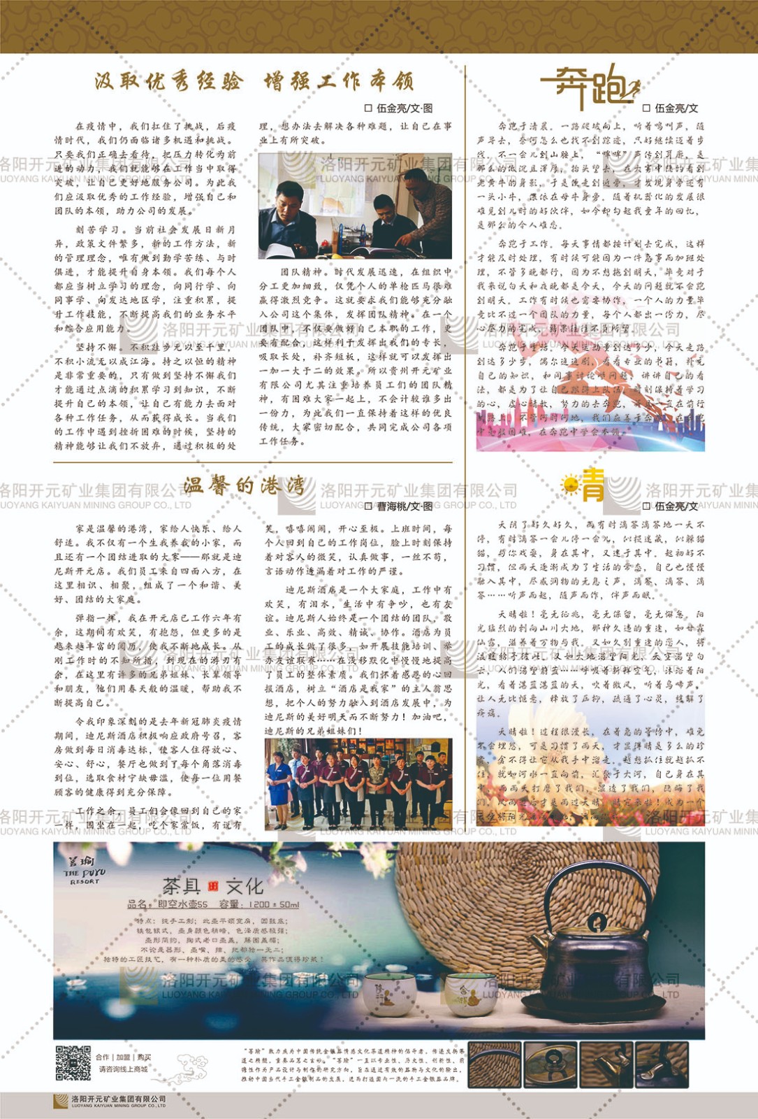 洛陽開元礦業(yè)集團(tuán)有限公司簡介洛陽開元礦業(yè)集團(tuán)有限公司,始成立于2006年,位于洛陽市開元大道269號。集團(tuán)旗下共有五余家全資子公司,業(yè)務(wù)涉及有色金屬礦山開發(fā)、礦產(chǎn)品購銷與進(jìn)出口貿(mào)易、房地產(chǎn)開發(fā)、文化藝術(shù)、企業(yè)管理與咨詢、資本投資等多個領(lǐng)域。民建河南省委委員、民建河南省委企業(yè)委副主任、民建洛陽市委委員、企業(yè)委主任、洛陽民建企業(yè)家協(xié)會會長許明月是公司創(chuàng)始人,現(xiàn)任洛陽開元礦業(yè)集團(tuán)有限公司董事長。在礦業(yè)領(lǐng)域,洛陽開元礦業(yè)集團(tuán)擁有多家實(shí)力雄厚的子公司:貴州開元礦業(yè)有限公司探、采礦權(quán)面積共11.33平方公里;興??h銅鑫礦業(yè)有限公司探礦權(quán)面積8.76平方公里,礦山資源潛力巨大;2021年,開元集團(tuán)與盧氏中科礦業(yè)有限公司開展戰(zhàn)略合作。盧氏中科礦業(yè)有限公司專注于有色金屬的浮選、加工和銷售,擁有強(qiáng)大的技術(shù)支撐平臺,是集探、采、選、冶、研為一體的中大型綜合礦業(yè)企業(yè)。目前,盧氏中科王家河1000噸選礦廠已成功投產(chǎn),雙河金礦、柳關(guān)欒盧鉛鋅礦相繼順利開工,樓房銀礦與圪老灣鉛鋅礦的深部探礦重大突破,標(biāo)志著礦山版圖取得重大進(jìn)展,為開元集團(tuán)后續(xù)發(fā)展奠定了堅(jiān)實(shí)基礎(chǔ)。在文化傳媒領(lǐng)域,洛陽市明月美術(shù)館通過豐富多樣的藝術(shù)展覽、學(xué)術(shù)研討和公共教育活動,努力打造一個集展覽、交流、教育、研究為一體的綜合性藝術(shù)平臺。此外,在金融投資領(lǐng)域,開元集團(tuán)旗下的北京明峰資本管理有限公司專注于投資具有高增長潛力的優(yōu)秀企業(yè),特別是高科技、新能源、環(huán)保等新興產(chǎn)業(yè),為客戶提供個性化的資產(chǎn)配置服務(wù)。在做好企業(yè)經(jīng)營的同時,開元集團(tuán)始終不忘企業(yè)的社會責(zé)任和家國情懷,以突出的愛心公益事跡,開展了一系列公益慈善活動:“民建林”公益事業(yè)通過“思源基金”“幫幫公益”線上公益平臺,與眾多愛心人士籌措資金20余萬元;資助541名貧困大學(xué)生共計270余萬元,推進(jìn)“數(shù)字助力——河南AI人才培養(yǎng)”;捐款10萬元,馳援京津冀、黑龍江洪水地質(zhì)災(zāi)害……公司于2017年底被洛陽市慈善總會評為“洛陽慈善風(fēng)云榜——十大愛心集體”。洛陽開元礦業(yè)集團(tuán)有限公司秉承持續(xù)發(fā)展理念,憑借多年來良好的企業(yè)信譽(yù)與經(jīng)營業(yè)績,與全國多家企業(yè)建立了良好合作關(guān)系,受到社會各界的一致好評,多次榮獲“納稅標(biāo)兵”“先進(jìn)企業(yè)”“招商引資模范企業(yè)”等榮譽(yù)稱號?;赝麃頃r路,開元人勠力同心,以“闖”的精神和“創(chuàng)”的勁頭,一路披荊斬棘,踏過千山萬水;展望新未來,開元人凝心聚力,不執(zhí)于“舊”,無畏于“新”,秉承“勇于跨越,追求卓越”的企業(yè)精神,乘著國家高質(zhì)量發(fā)展新征程的東風(fēng),跨過高山,越過大海,向著集團(tuán)多元化、國際化的目標(biāo),逐夢遠(yuǎn)航,跨越前行!